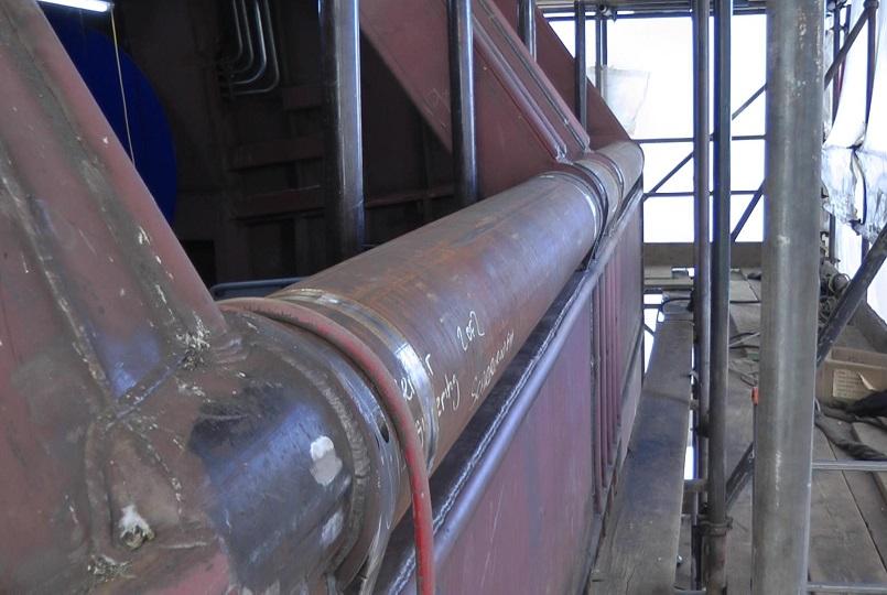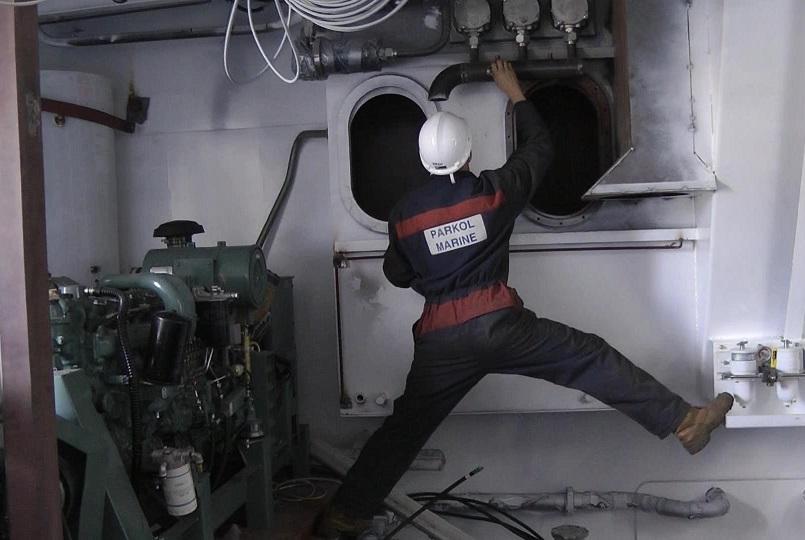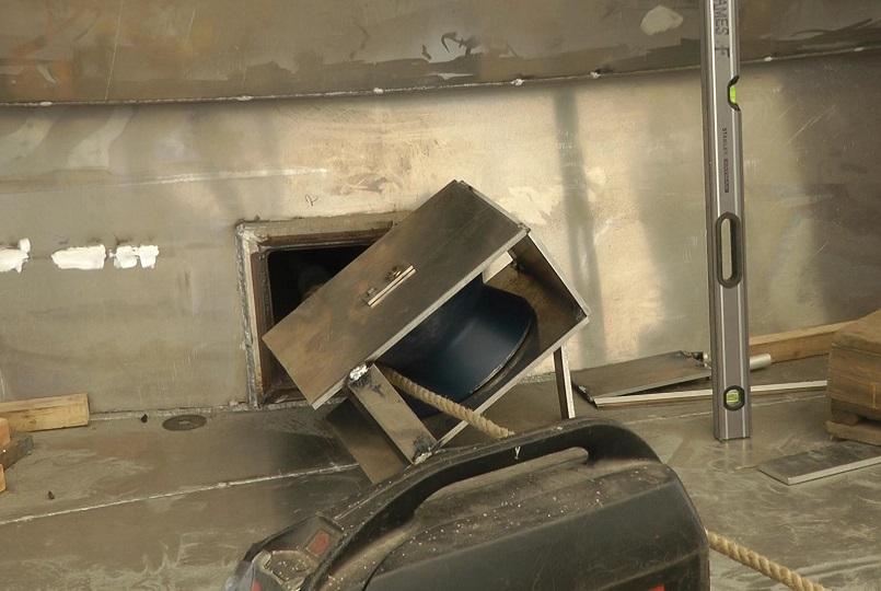 The pulley system for the tow rope is being built and aligned; here as the rope exits the shelter deck