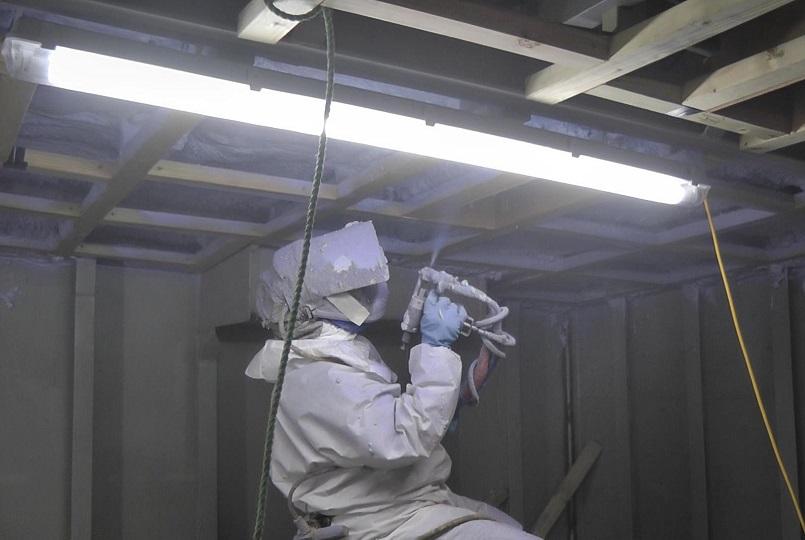 Insulation being sprayed onto the fish room ceiling