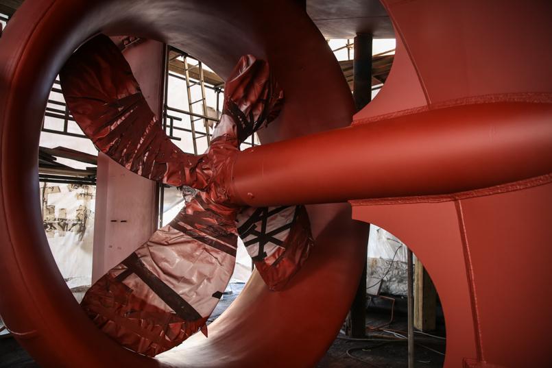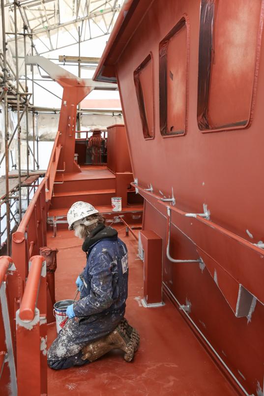 The propeller is protected as primer is applied to the rest of the trawler