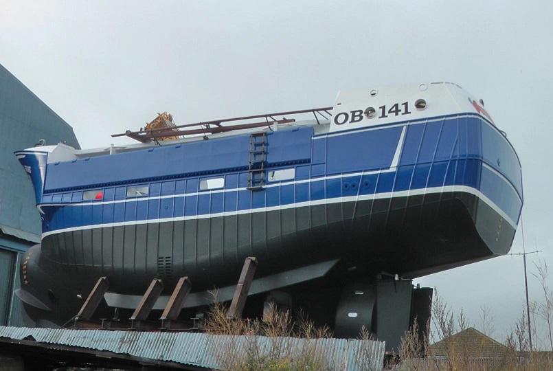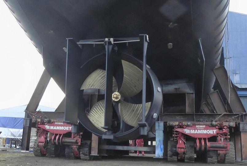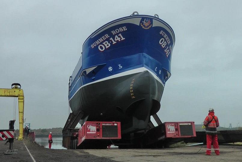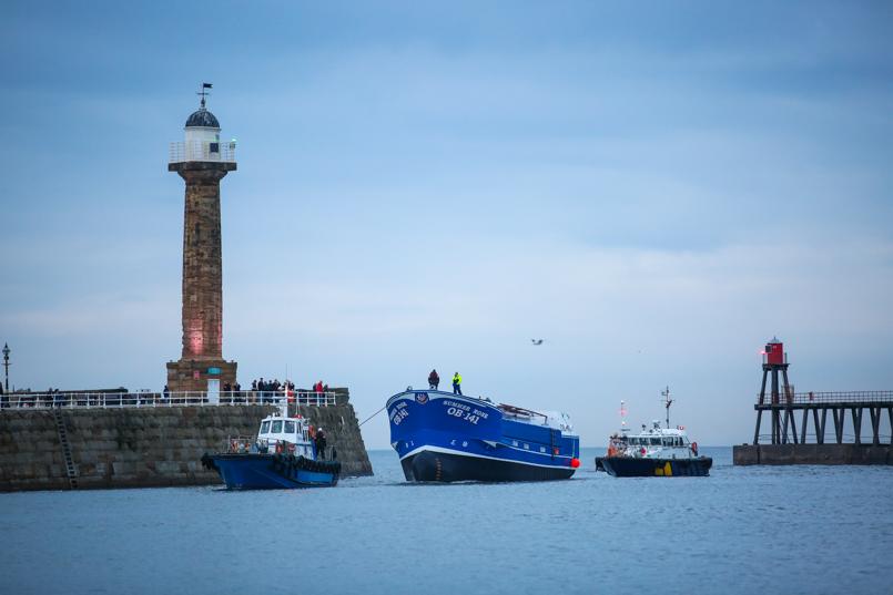 Progressing down the slipway with the iconic Tees transporter bridge in the background (left)