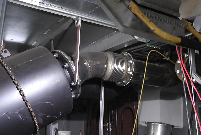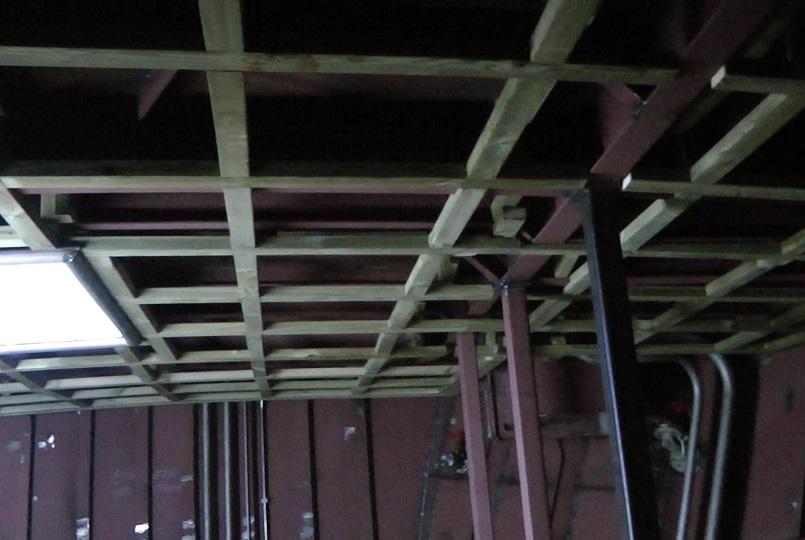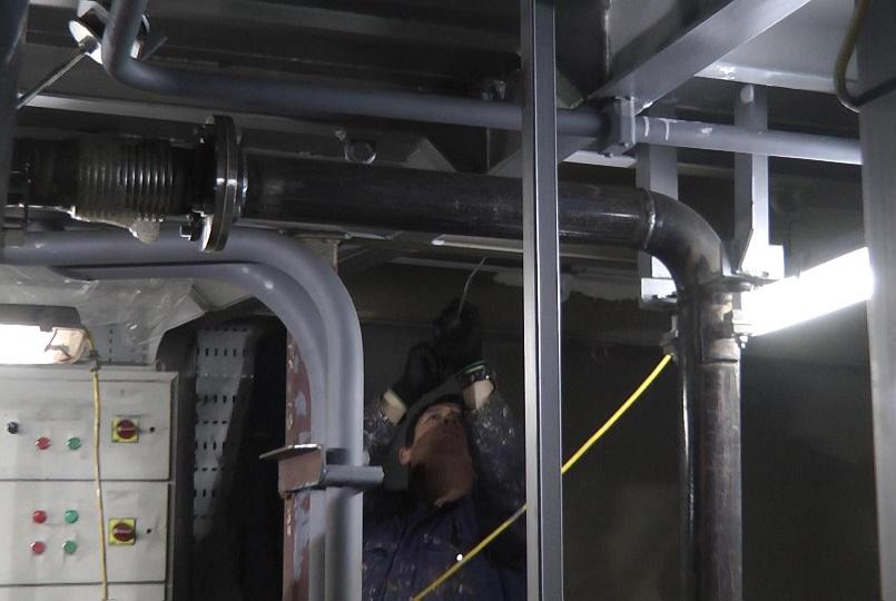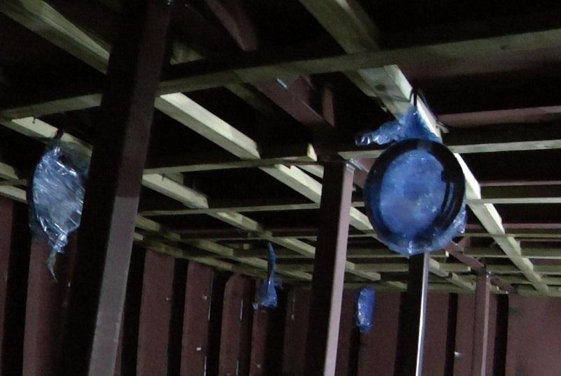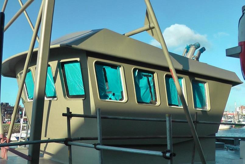Windows in the wheelhouse have been masked in preparation for spray painting
