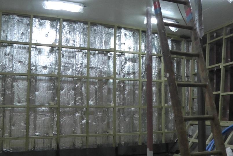 The fish room rear bulkhead with insulation fitted and framing being built