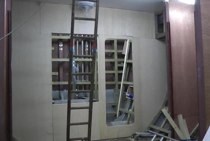 The fish room front bulkhead with partitioning under construction