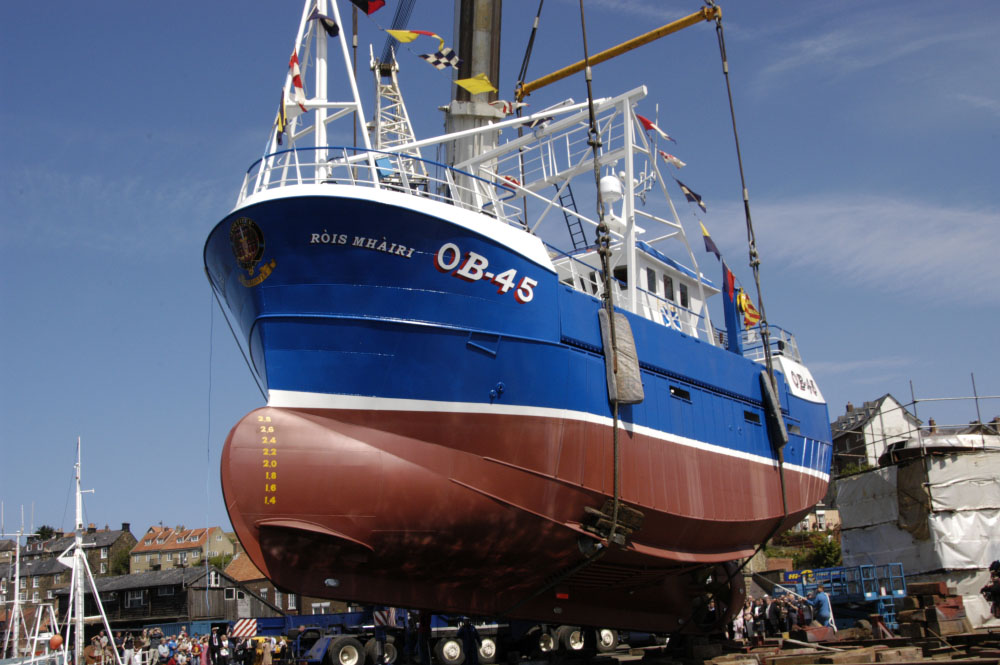 Steel hulled motor fishing vessel, double chine, transom stern, bulbous bow, soft nose stem and rigged for scallop dredge fishing, with dredge emptying doors and catch handling conveyors for 10 dredges per side.