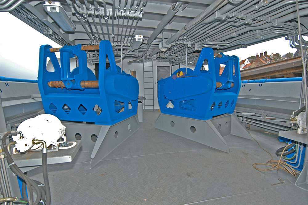 Main deck working area to have split trawl winches, hinged outrigger arms, dredge pulling in winches, with catch conveyors and dredge emptying doors incorporated into bulwark sides.