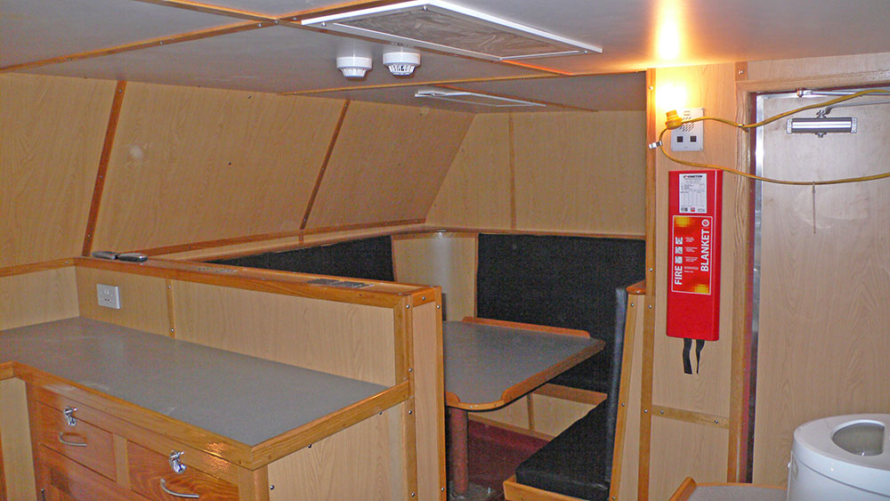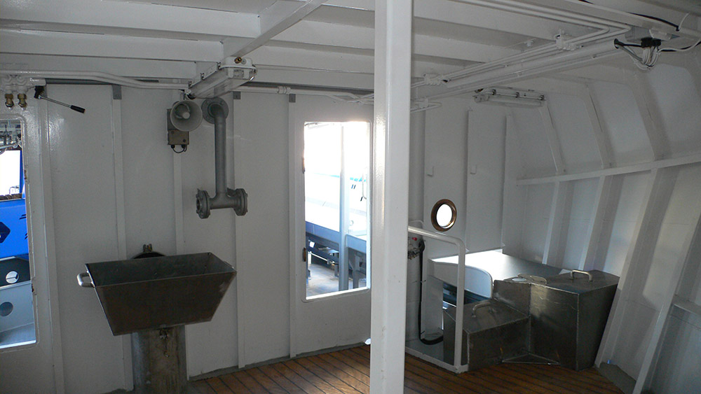 Aft deckhouse for combined galley and mess, washroom, lobby and workshop, with wheelhouse over.