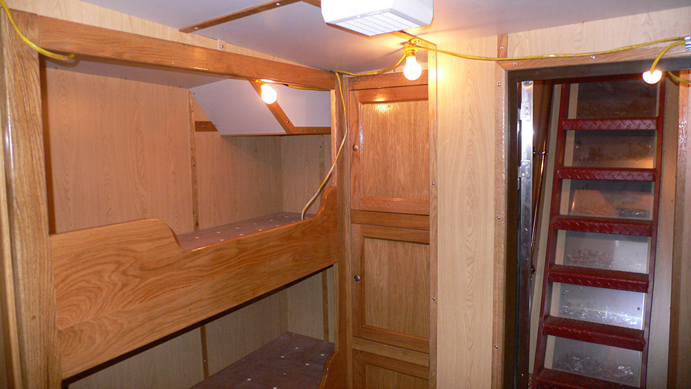 Below deck to be subdivided by four watertight bulkheads into: aft accommodation with steering gear, engine room, hold and forepeak tank/sonnar/gear store.