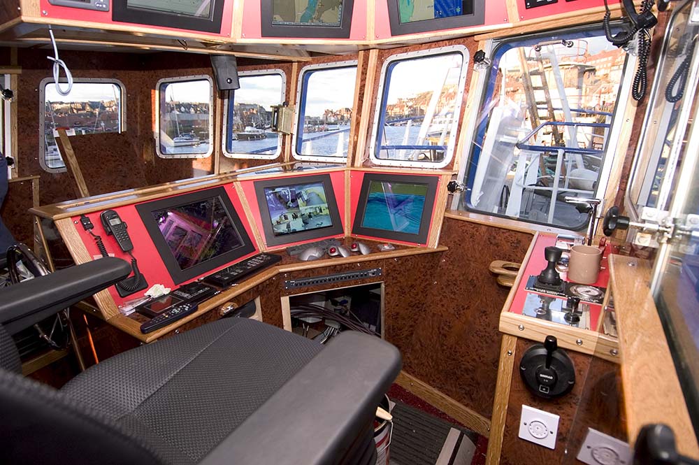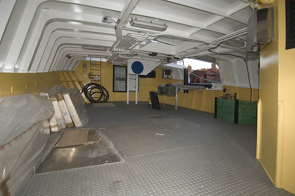 The main deck is to have an aft steel galley, mess and washroom casing, to starboard. Pot hauling position at starboard, forward. Pot shooting door in transom and in starboard side bulwark.