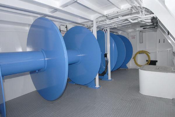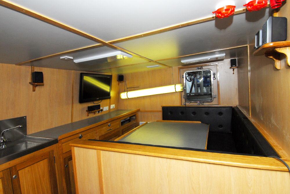 The main deck is to have an athwart ships, steel casing centred aft of midships for galley, mess and washroom. Aft side to have a steel shelter and integral gallow arrangement over net drum space, continued to transom. Foreward, to have a non-weather tight aluminium alloy fish handling shelter space with winch.