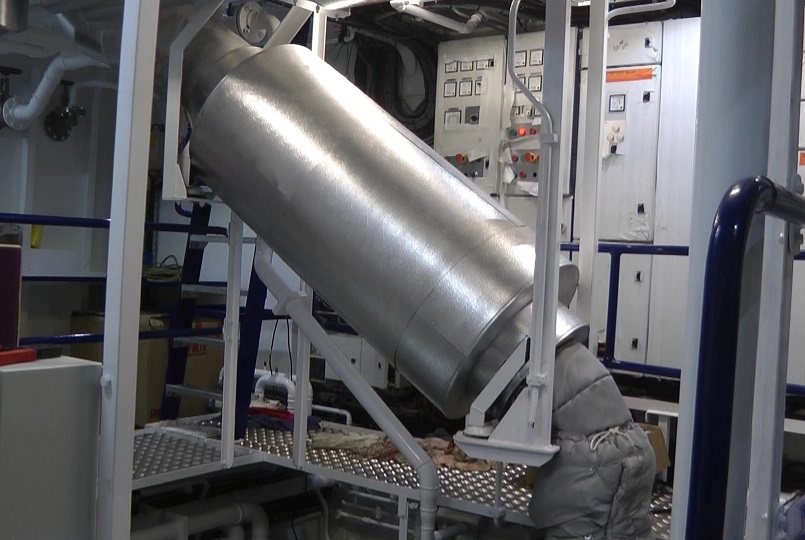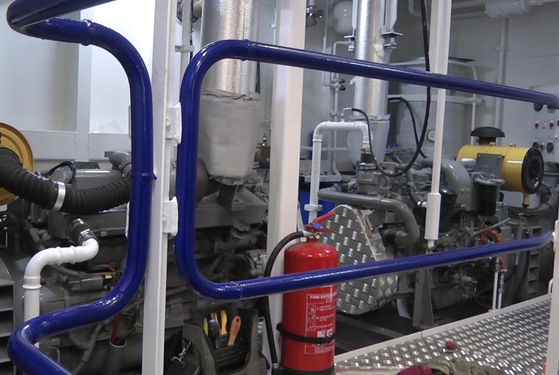 The engine room showing electrical panels and main engine exhaust